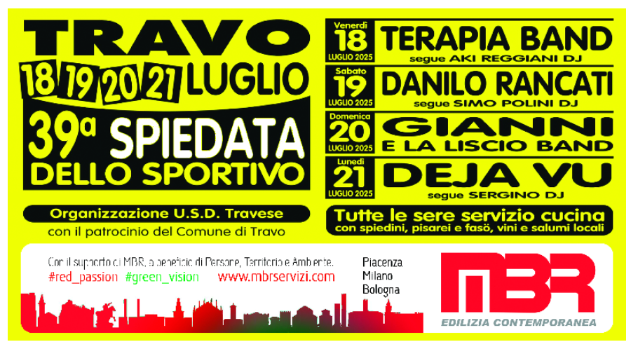 Torna a Travo, da venerdì 18 a lunedì 21 luglio, la 39ª edizione della Spiedata dello Sportivo, organizzata dall’U.S.D. Travese 1965 con il patrocinio del Comune di Travo.