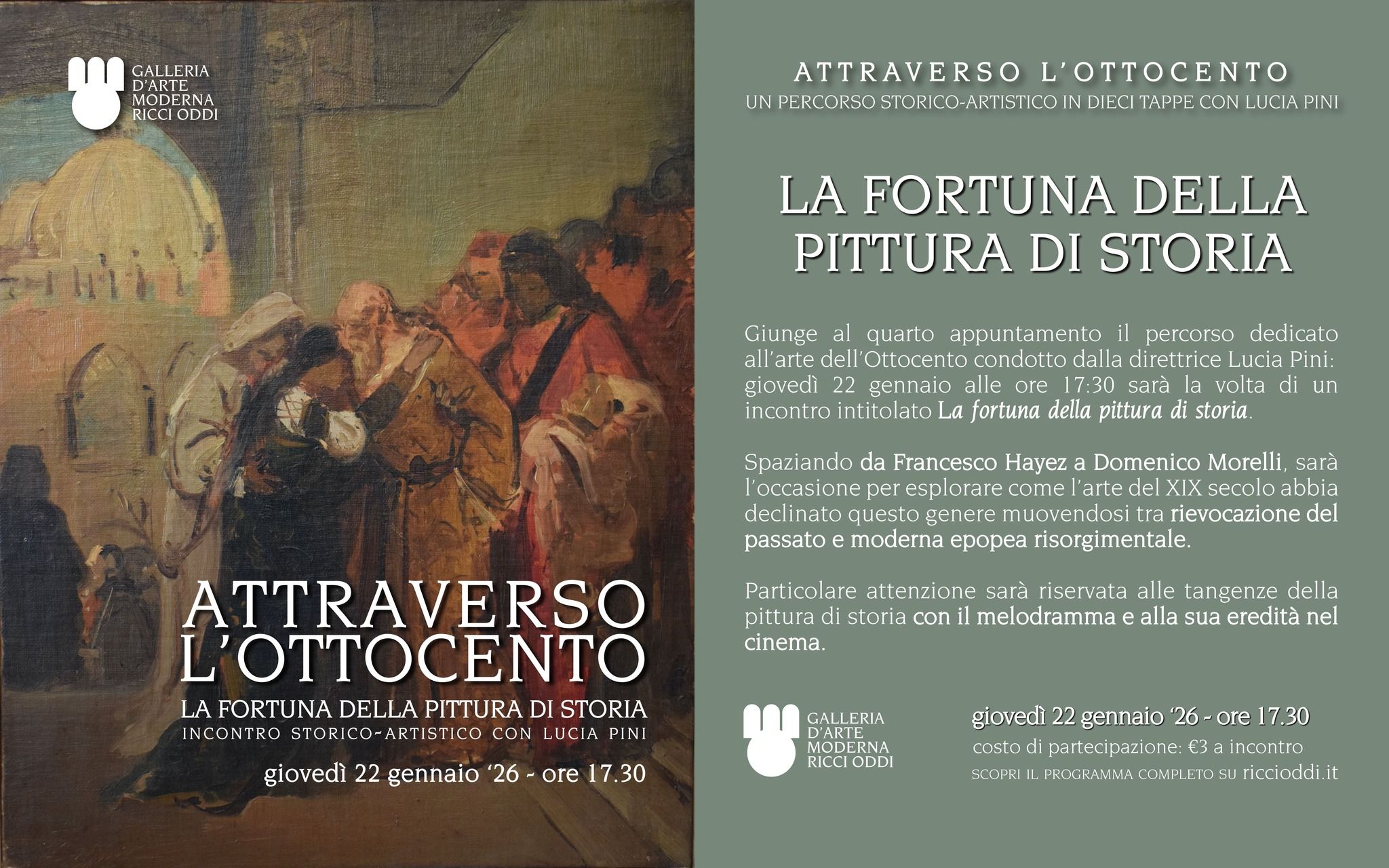 L’incontro, dal titolo “La fortuna della pittura di storia”, propone un approfondimento sul ruolo e sull’evoluzione di questo genere nell’arte del XIX secolo.