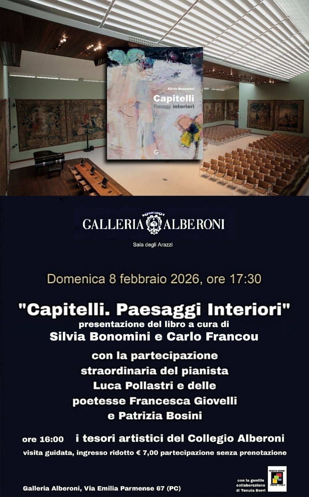 Domenica 8 febbraio, alle ore 17.30, la Sala degli Arazzi della Galleria Alberoni ospita la presentazione del volume “Capitelli. Paesaggi interiori”, dedicato all’opera pittorica di Paolo Capitelli.