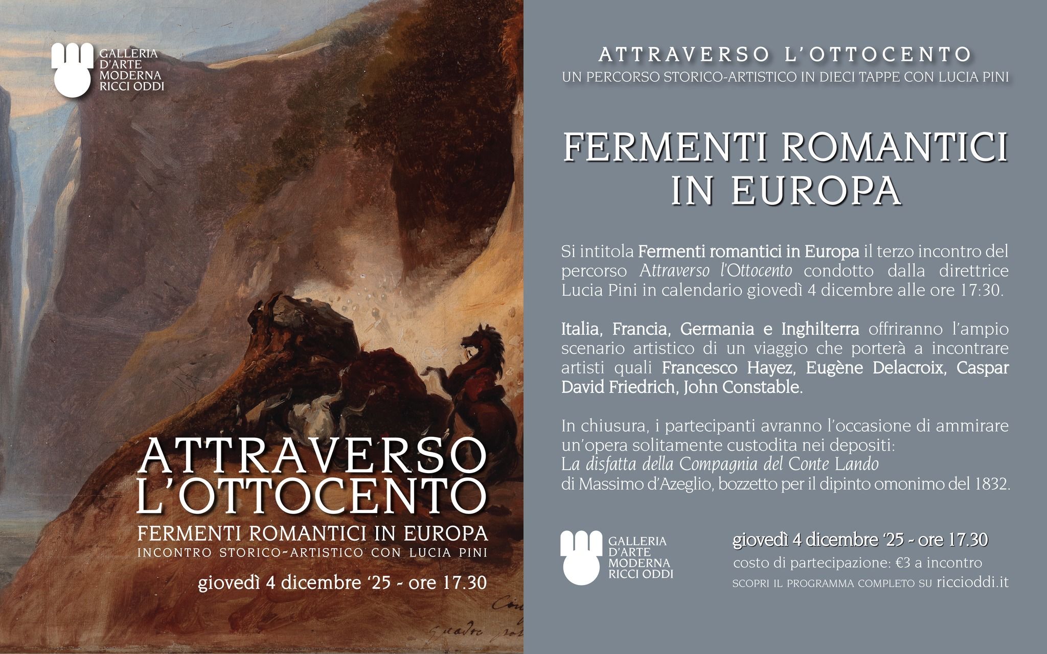 Il viaggio proseguirà tra Italia, Francia, Germania e Inghilterra, alla scoperta del panorama culturale del Romanticismo europeo e dei suoi protagonisti: Francesco Hayez, Eugène Delacroix, Caspar David Friedrich, John Constable, solo per citarne alcuni.