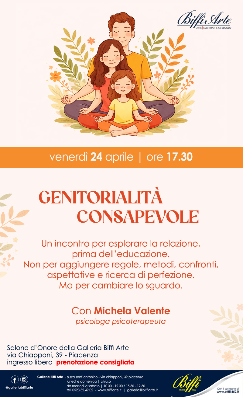 Giovedì 24 aprile, alle ore 18.00, nel Salone d’Onore della Galleria Biffi Arte, ospita l’incontro "Genitorialità consapevole", con Michela Valente, psicologa psicoterapeuta.