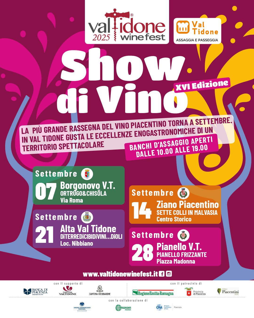 Il festival itinerante celebra le eccellenze vinicole locali e accompagna i visitatori in un percorso fatto di gusto, tradizionee cultura del territorio, animando i paesi promotori e l’intera vallata con spettacoli, intrattenimento, buon cibo e, naturalmente, l’ottimo vino dei Colli Piacentini DOC, tra assaggi, degustazioni guidate e abbinamenti culinari.