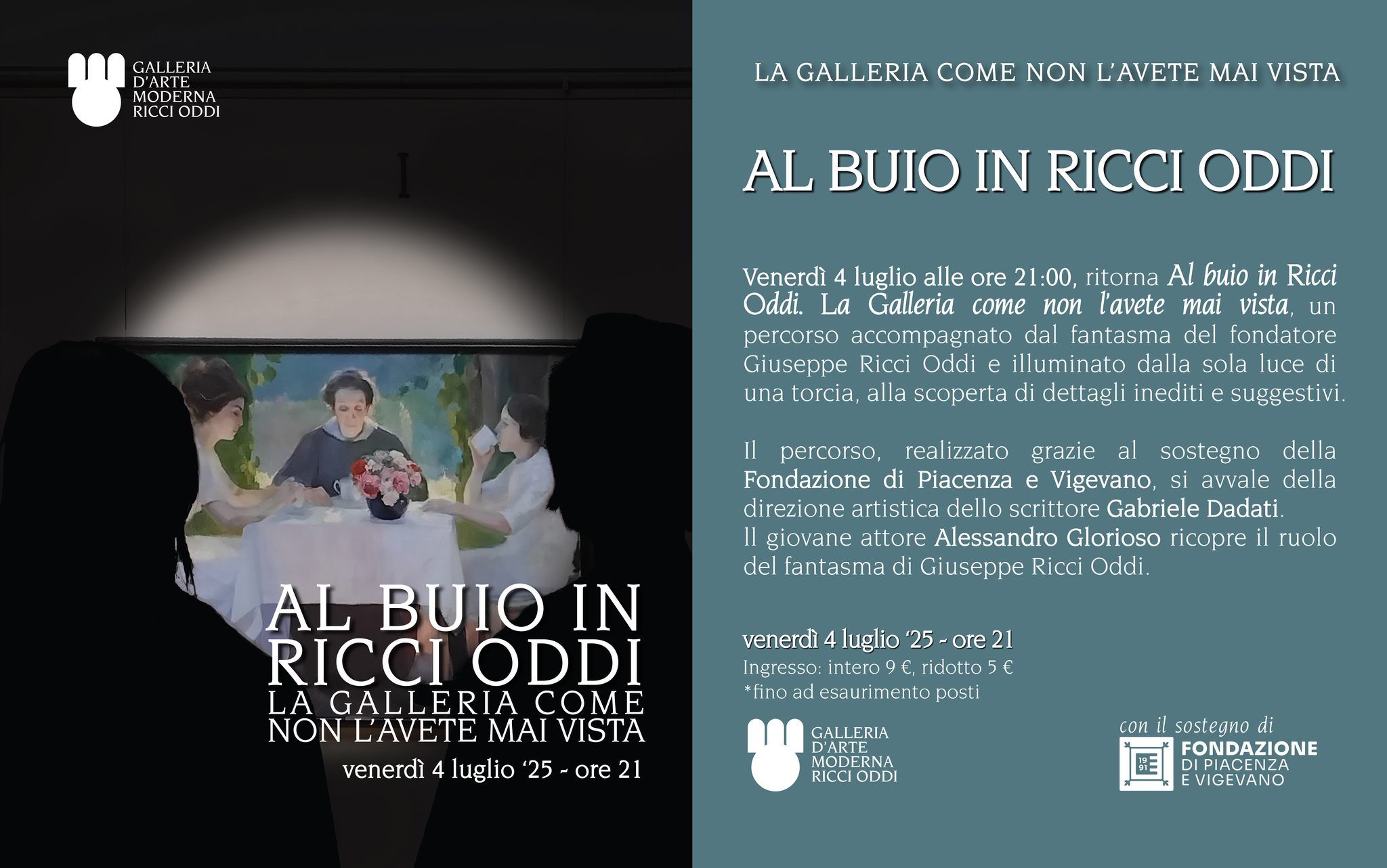 Venerdì 4 luglio alle ore 21.00 torna “Al buio in Ricci Oddi”, un’esperienza unica per scoprire la Galleria Ricci Oddi come non è mai stata vista: un percorso serale illuminato dalla sola luce di una torcia e accompagnato dal fantasma del fondatore Giuseppe Ricci Oddi, alla scoperta di dettagli insoliti e atmosfere suggestive.