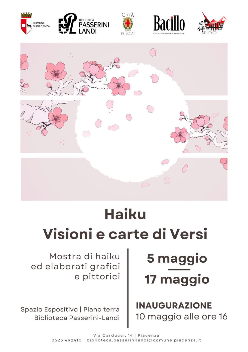 Dal 5 al 17 maggio, la Biblioteca Passerini-Landi ospiterà la mostra "Haiku: visioni e carte di-versi", un'esposizione che unisce la poesia haiku a opere grafiche e pittoriche realizzate dagli studenti del Liceo "Cassinari" di Piacenza, accostate a lavori di artisti affermati.