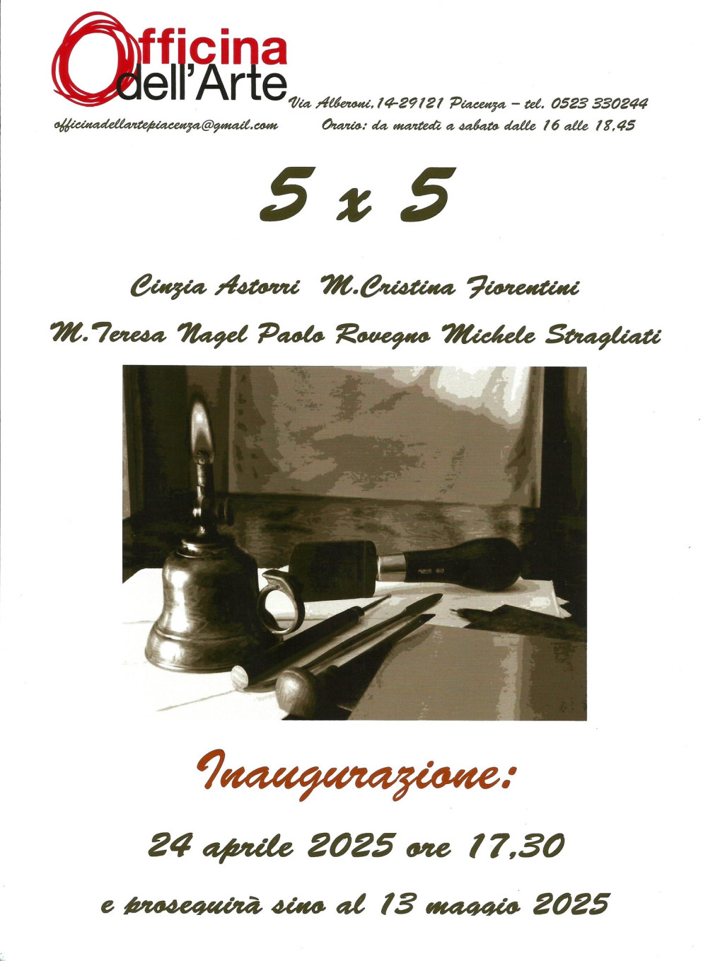 Dal 24 aprile al 13 maggio, la galleria Officina dell’Arte di Piacenza ospiterà la mostra collettiva 5 x 5, un’esposizione che riunisce le opere di cinque artisti: Cinzia Astorri, M. Cristina Fiorentini, M. Teresa Nagel, Paolo Rovegno e Michele Stragliati.
