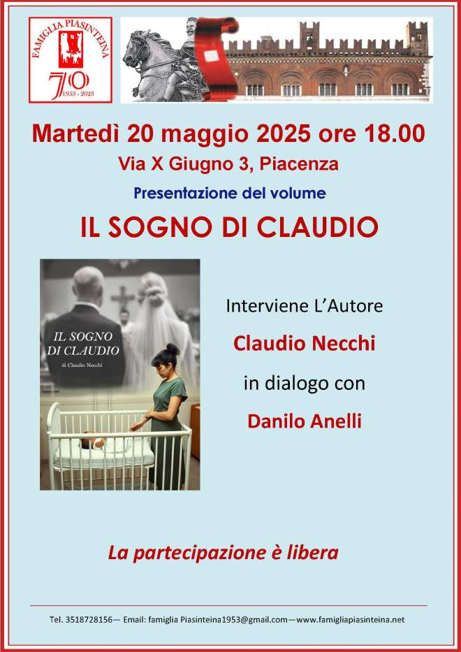 Martedì 20 maggio alle ore 18.00 presso la sede della Famiglia Piasinteina si terrà la presentazione del volume “Il sogno di Claudio”, terzo libro di Claudio Necchi.
