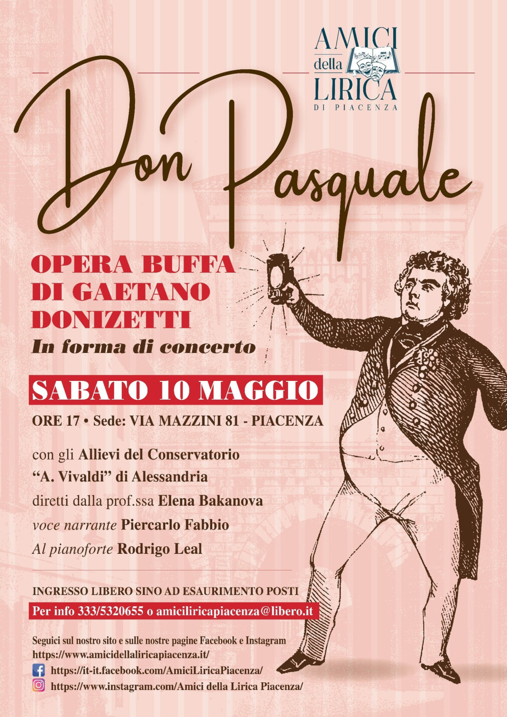 Sabato 10 maggio, alle ore 17.00, presso la sede degli Amici della Lirica in via Mazzini 81 a Piacenza, andrà in scena Don Pasqualedi Gaetano Donizetti, proposto in forma di concerto dagli allievi del Conservatorio A. Vivaldi di Alessandria.