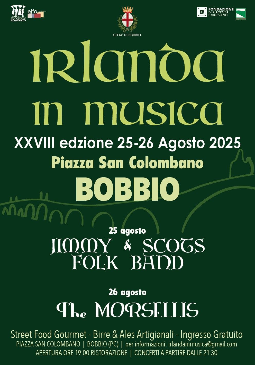Lunedì 25 e martedì 26 agosto le sonorità celtiche tornano ad animare il borgo medioevale di Bobbio con la rassegna “Irlanda In Musica”, 26ª edizione della grande festa di musica e cultura celtica in Piazza San Colombano. La kermesse trasformerà Bobbio in una cittadella irlandese, grazie alla musica e agli stand tipici con birra e cibo gourmet.