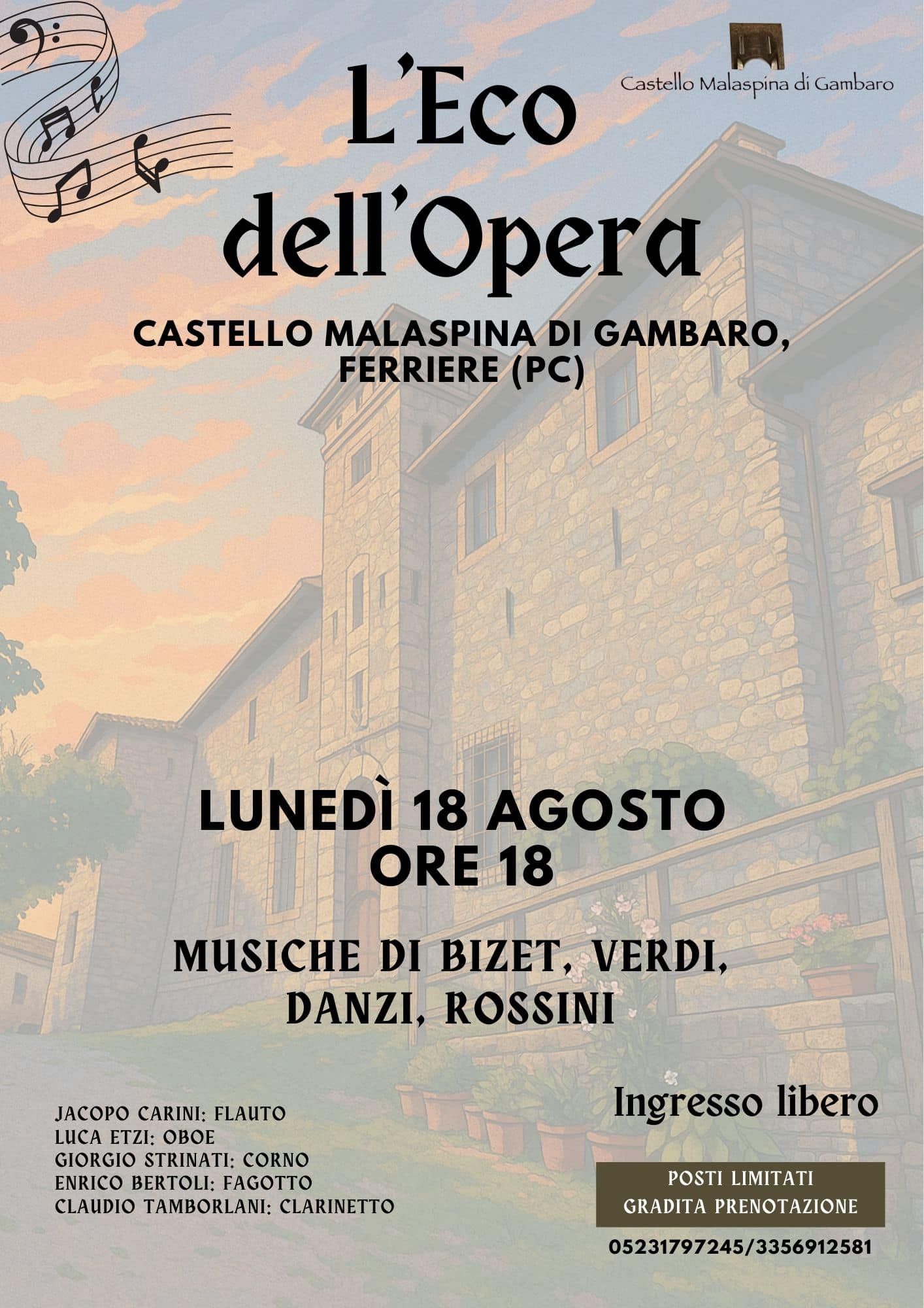 Lunedì 18 agosto, alle ore 18.00, il Castello Malaspina di Gambaro a Ferriere ospita L’Eco dell’Opera, un viaggio musicale tra i grandi capolavori operistici di Bizet, Verdi, Danzi e Rossini.