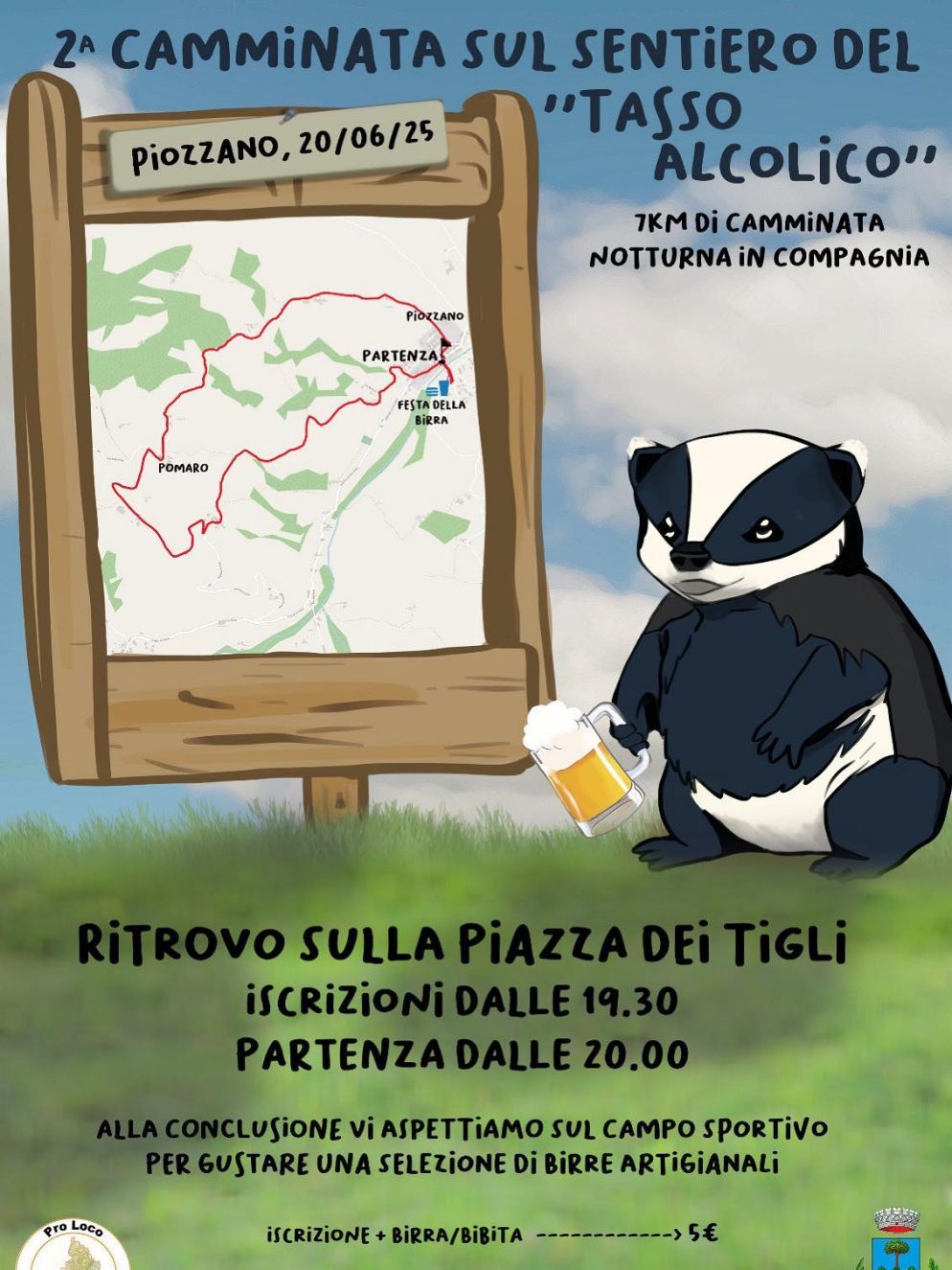 Venerdì 20 giugno a Piozzano si svolgerà la 2ª Camminata sul sentiero del "Tasso alcolico", una passeggiata notturna di 7 km tra le suggestive colline della Val Luretta.