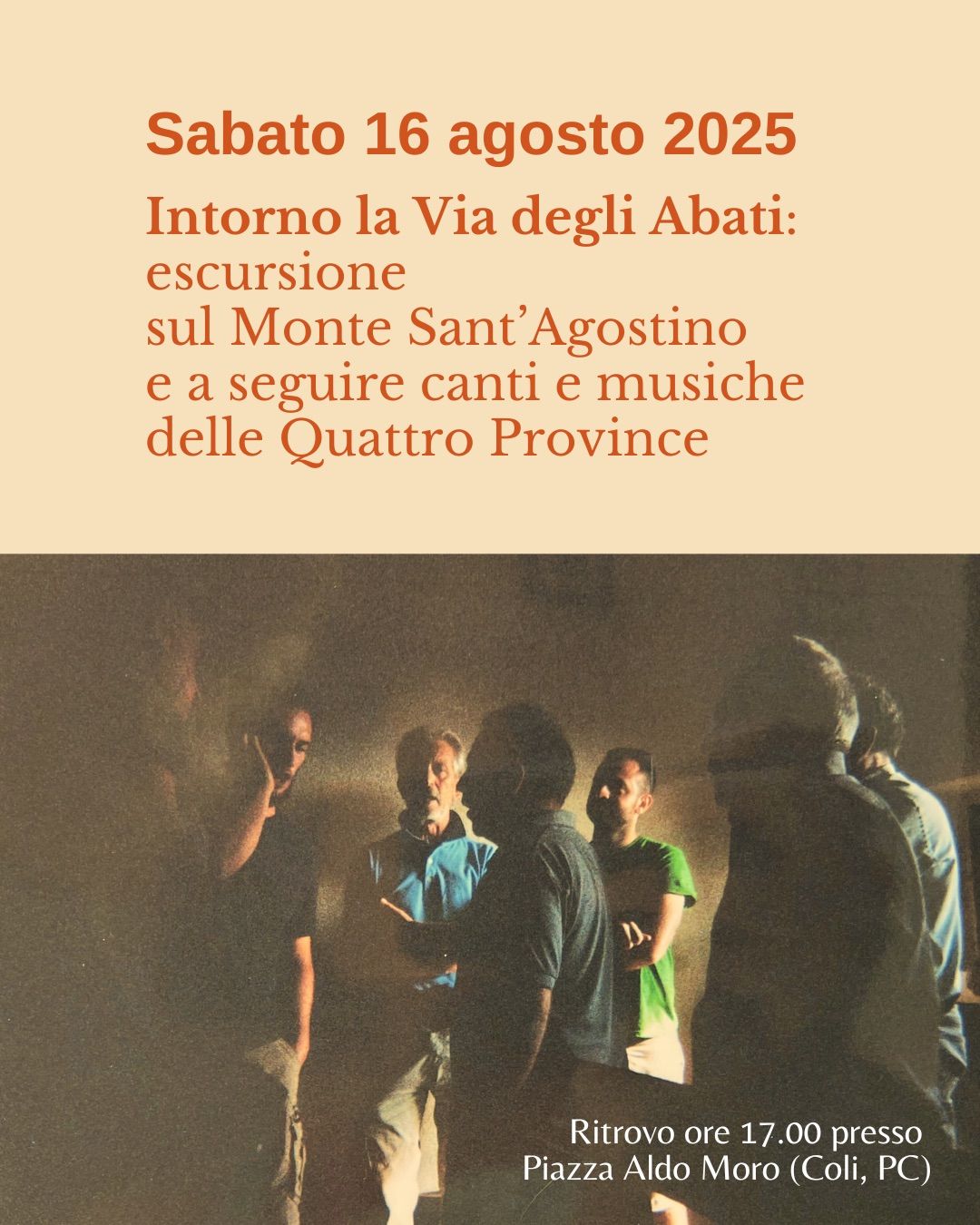 Al termine della discesa, ai piedi del monte, il Santuario accoglierà con un rinfresco curato dall’Associazione Bagai ad Cor, seguito dai canti del Coro Val Curiasca e dalle atmosfere musicali di Maddalena Scagnelli e Franco Guglielmetti, per una serata che intreccia il piacere del cammino con le sonorità antiche delle Quattro Province.