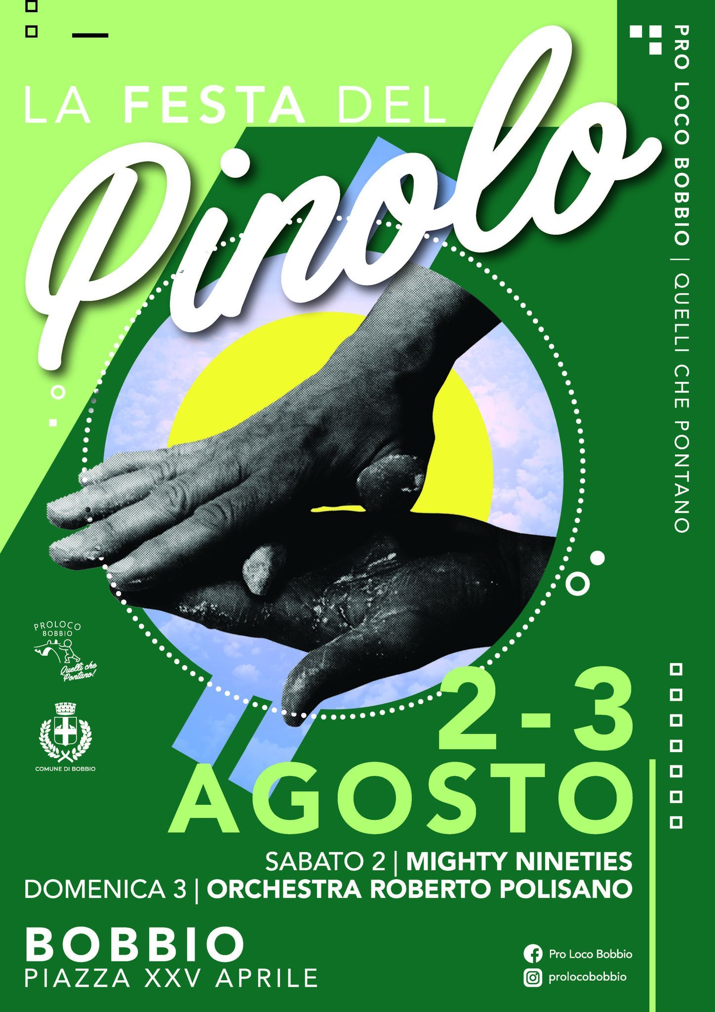 Sabato 2 e domenica 3 agosto torna, in Piazza XXV Aprile a Bobbio la tradizionale Festa del Pinolo, due serate dedicate a uno dei piatti simbolo della tradizione bobbiese: i Pinoli al sugo di funghi, un primo piatto di pasta fresca fatta a mano, a forma di pinolo, preparata con ricotta fresca, spinaci o erbette, patate, formaggio grana, uova, farina bianca e noce moscata.