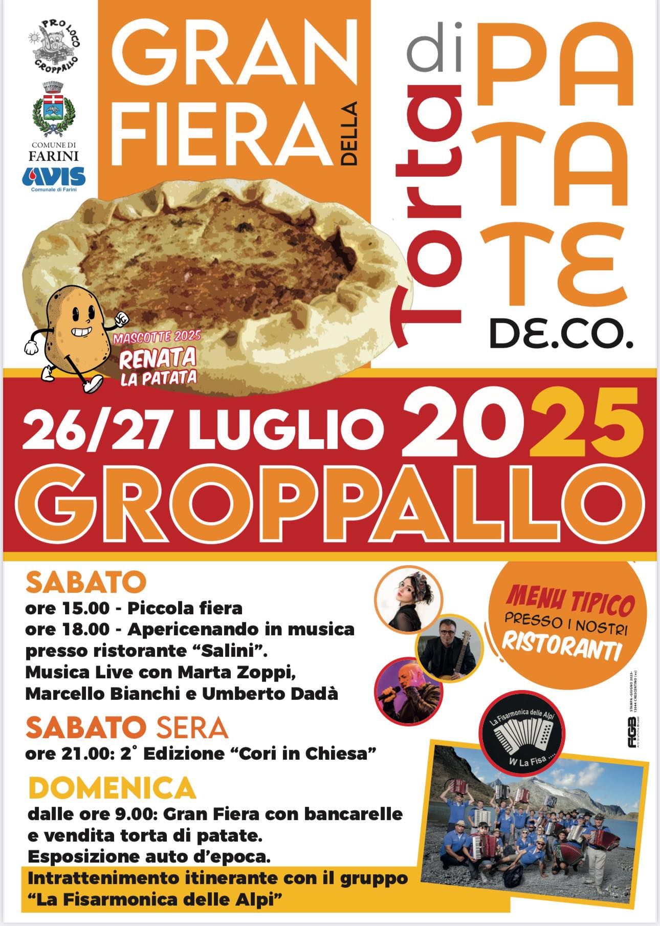 Sabato 26 e domenica 27 luglio Groppallo ospita la Gran Fiera della Torta di Patate De.Co., un appuntamento imperdibile dedicato al piatto tipico del territorio.
