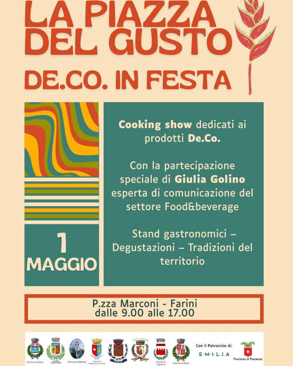 Giovedì 1° maggio Piazza Marconi a Farini si animerà con “La Piazza del Gusto - De.Co. in Festa”, una giornata dedicata ai sapori autentici e alle tradizioni culinarie del territorio.