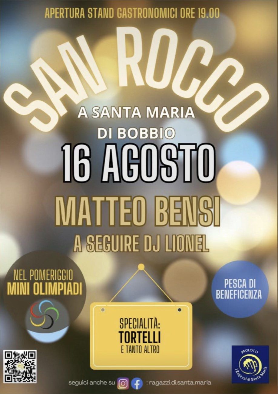 Sabato 16 agosto, a Santa Maria di Bobbio, torna la Festa di San Rocco, un’intera giornata dedicata a gastronomia, musica e divertimento.