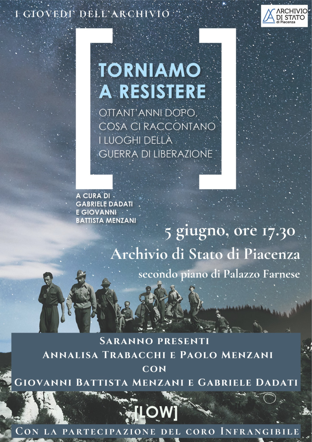 Nell’ambito del ciclo I giovedì dell’Archivio, l’Archivio di Stato ospita, giovedì 5 giugno alle ore 17.30, la presentazione del volume "Torniamo a resistere. Ottant’anni dopo cosa ci raccontano i luoghi della guerra di liberazione", a cura di Gabriele Dadati e Giovanni Battista Menzani.