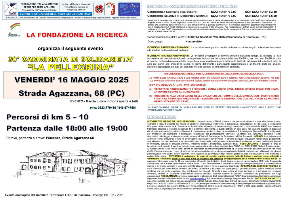 La Fondazione La Ricerca organizza, venerdì 16 maggio, la 30° Camminata di Solidarietà "La Pellegrina".