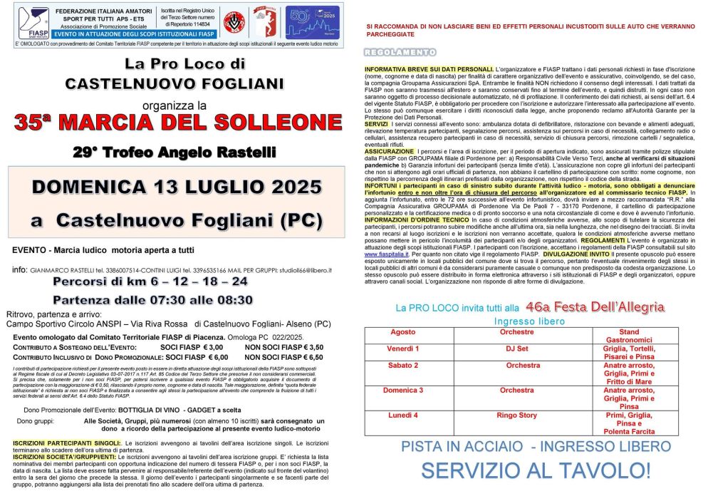 La Pro Loco di Castelnuovo Fogliani organizza, domenica 13 luglio, la  35ª Marcia del Solleone - 29° Trofeo Angelo Rastelli, marcia ludico motoria a passo libero, aperta a tutti.