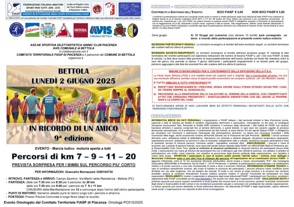 Lunedì 2 giugno a Bettola, si terrà la 9ª edizione della marcia "In ricordo di un amico", un evento podistico ludico motorio a passo libero aperto a tutti.