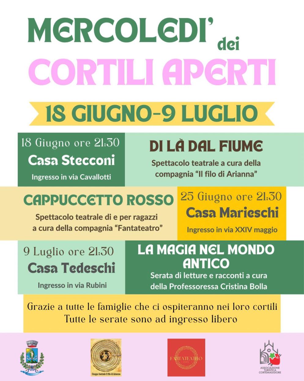Parte mercoledì 18 giugno la rassegna “Mercoledì dei Cortili Aperti”, un’iniziativa culturale animerà alcuni cortili privati di Cortemaggiore grazie alla disponibilità di famiglie che apriranno i propri spazi alla comunità.