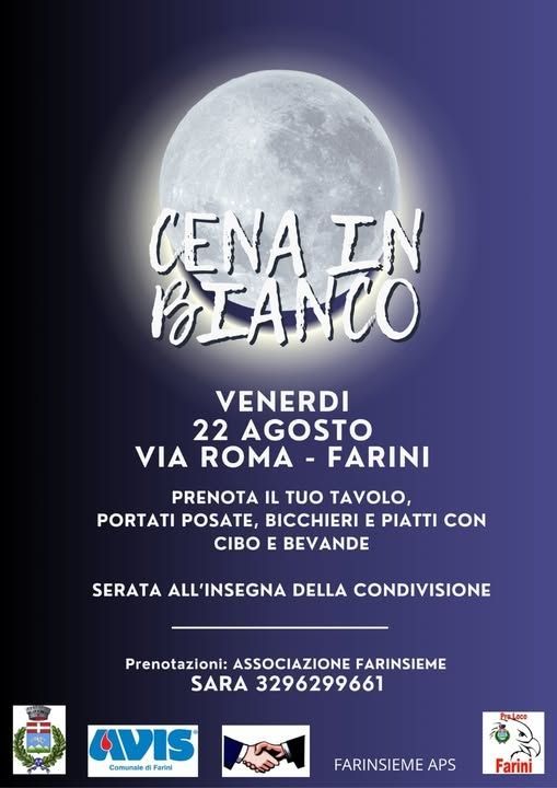 Venerdì 22 agosto in via Roma a Farini si terrà la tradizionale Cena in Bianco, una serata speciale all’insegna della condivisione e della convivialità.