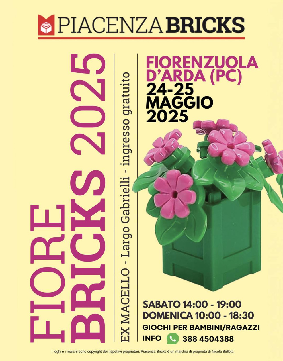 Sabato 24 e domenica 25 maggio, presso lo spazio espositivo dell'Ex Macello di Fiorenzuola d'Arda (Largo Gabrielli - di fronte al Cinema Capitol), torna “Fiore Bricks”, l’evento dedicato ai mattoncini LEGO a cura del club Piacenza Bricks.