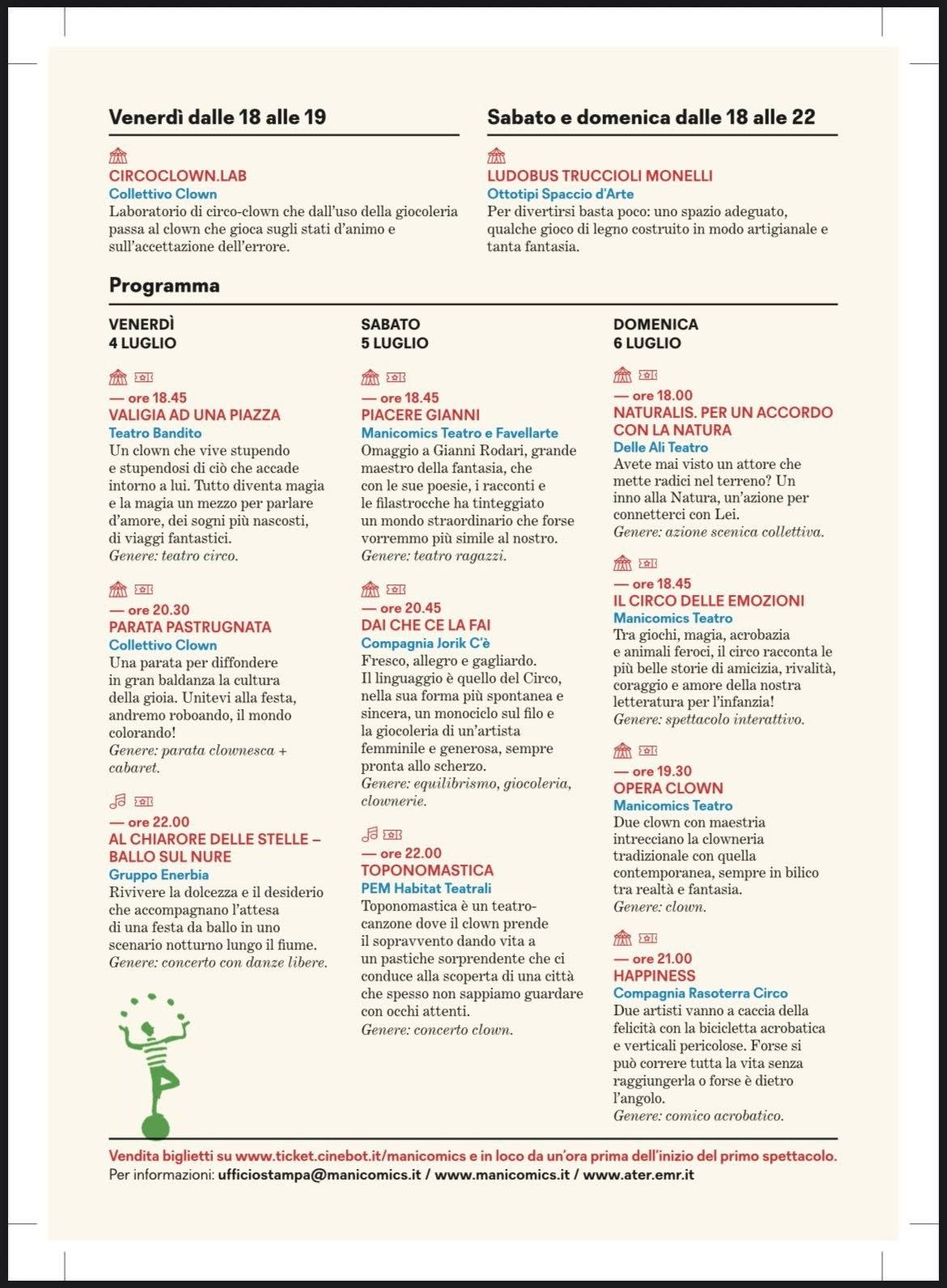 Genere: comico acrobatico. - Dalle 18.00 alle 22.00 LUDOBUS TRUCCIOLI MONELLI – Ottotipi Spaccio d’Arte. Per divertirsi basta poco: uno spazio adeguato, qualche gioco di legno costruito in modo artigianale e tanta fantasia.