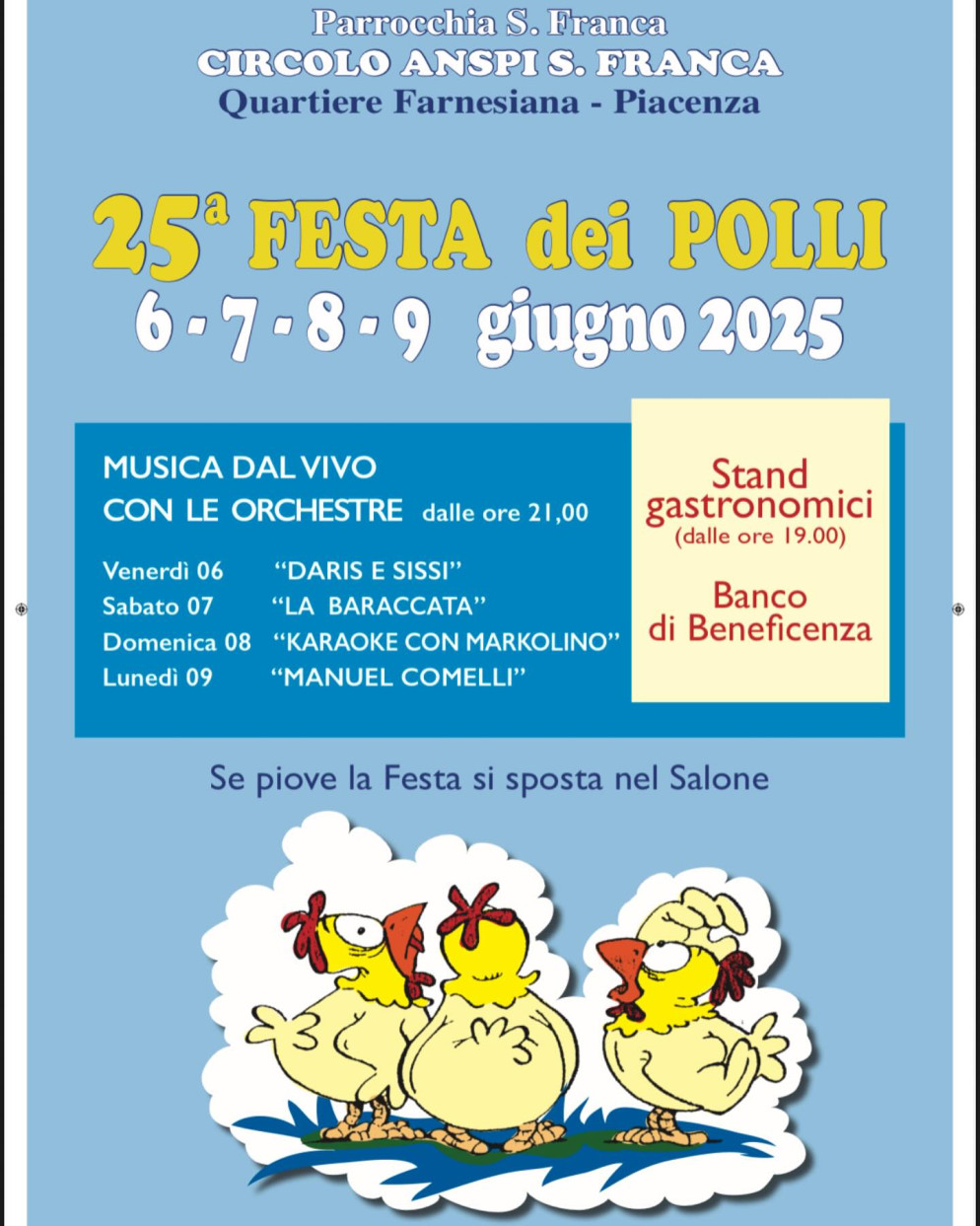 Da venerdì 6 a lunedì 9 giugno il quartiere Farnesiana di Piacenza ospita la Festa dei Polli: quattro serate di buon cibo, musica dal vivo e tanto divertimento.