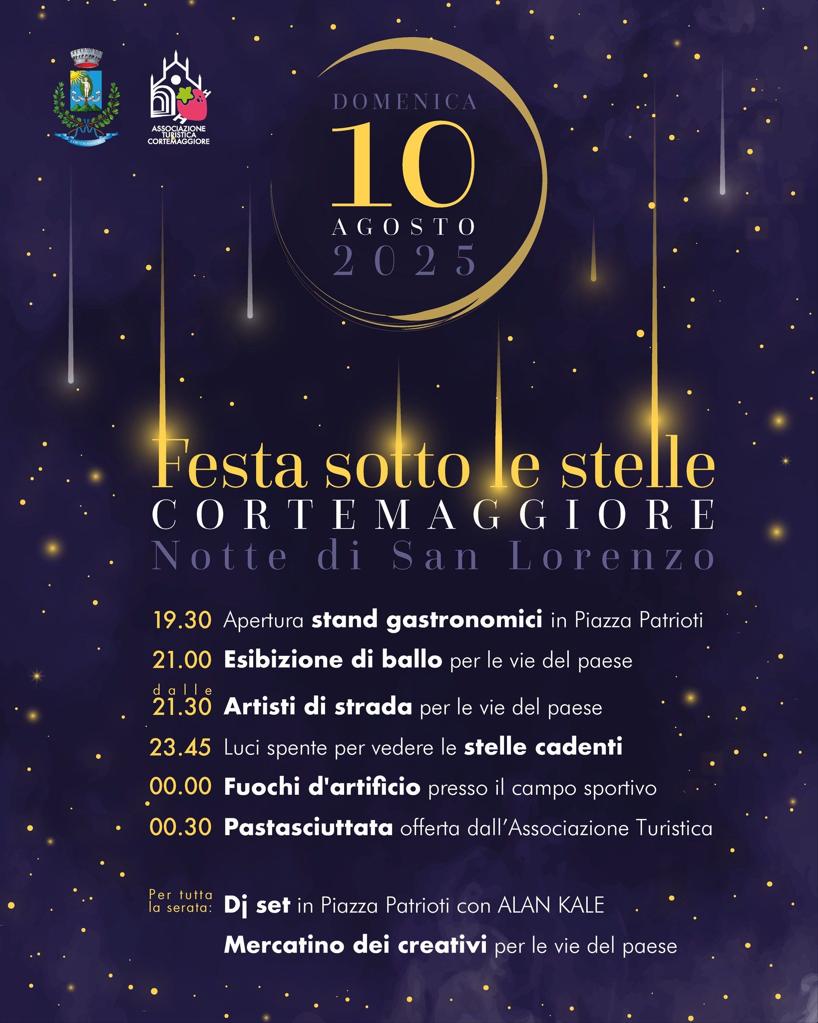 A partire dalle 19.30, le vie e le piazze di Cortemaggiore si animeranno con stand gastronomici, esibizioni di ballo, artisti di strada, un suggestivo momento di osservazione delle stelle cadenti, spettacolo pirotecnico, dj set, mercatino dei creativi e tante altre sorprese.