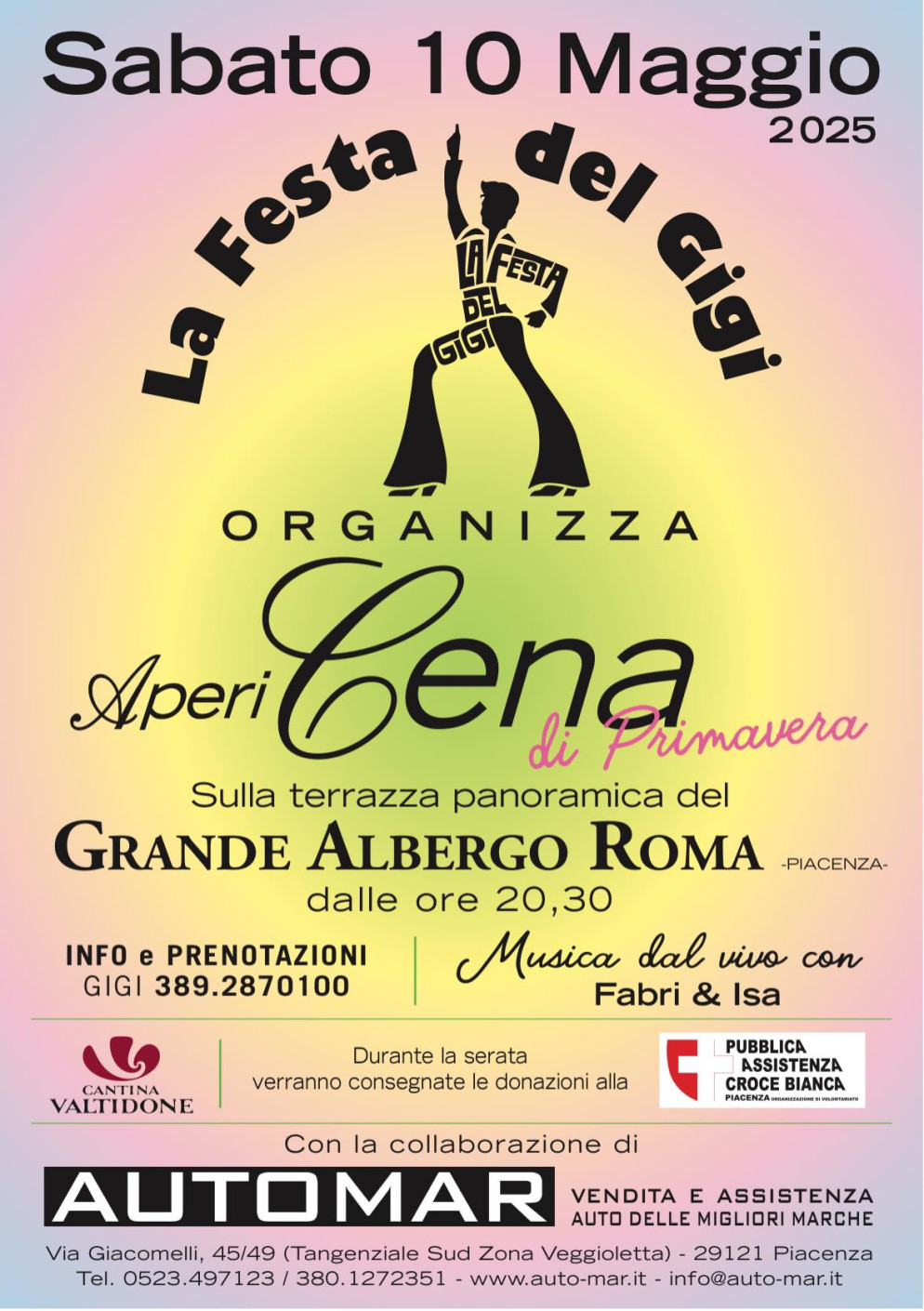 Sabato 10 maggio, alle ore 20.30, la terrazza panoramica del Grande Albergo Roma di Piacenza farà da sfondo a un evento speciale: torna la Cena di Primavera, organizzata da La Festa del Gigi a sostegno della Pubblica Assistenza Croce Bianca Piacenza.