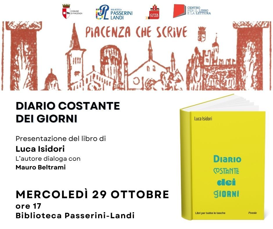 Mercoledì 29 ottobre, alle ore 17.00, presso la Biblioteca Passerini Landi, Luca Isidori presenterà il suo libro “Diario costante dei giorni”.