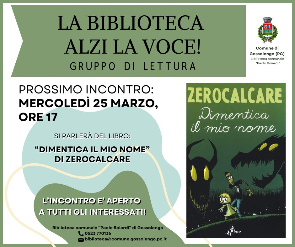 Mercoledì 25 marzo alle ore 17.00, la Biblioteca comunale "Paolo Boiardi" di Gossolengo ospita un nuovo appuntamento del gruppo di lettura "La biblioteca alzi la voce!".