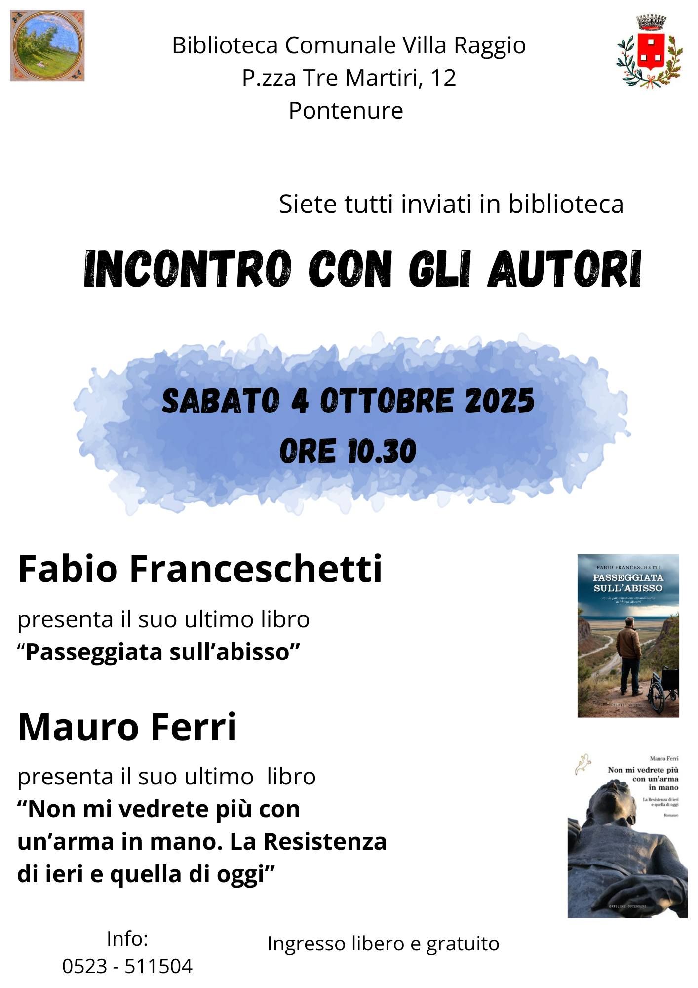 Sabato 4 ottobre alle ore 10.30, presso la Biblioteca Comunale Villa Raggio in Piazza Tre Martiri 12 a Pontenure, si terrà un incontro con gli autori Fabio Franceschetti e Mauro Ferri.
