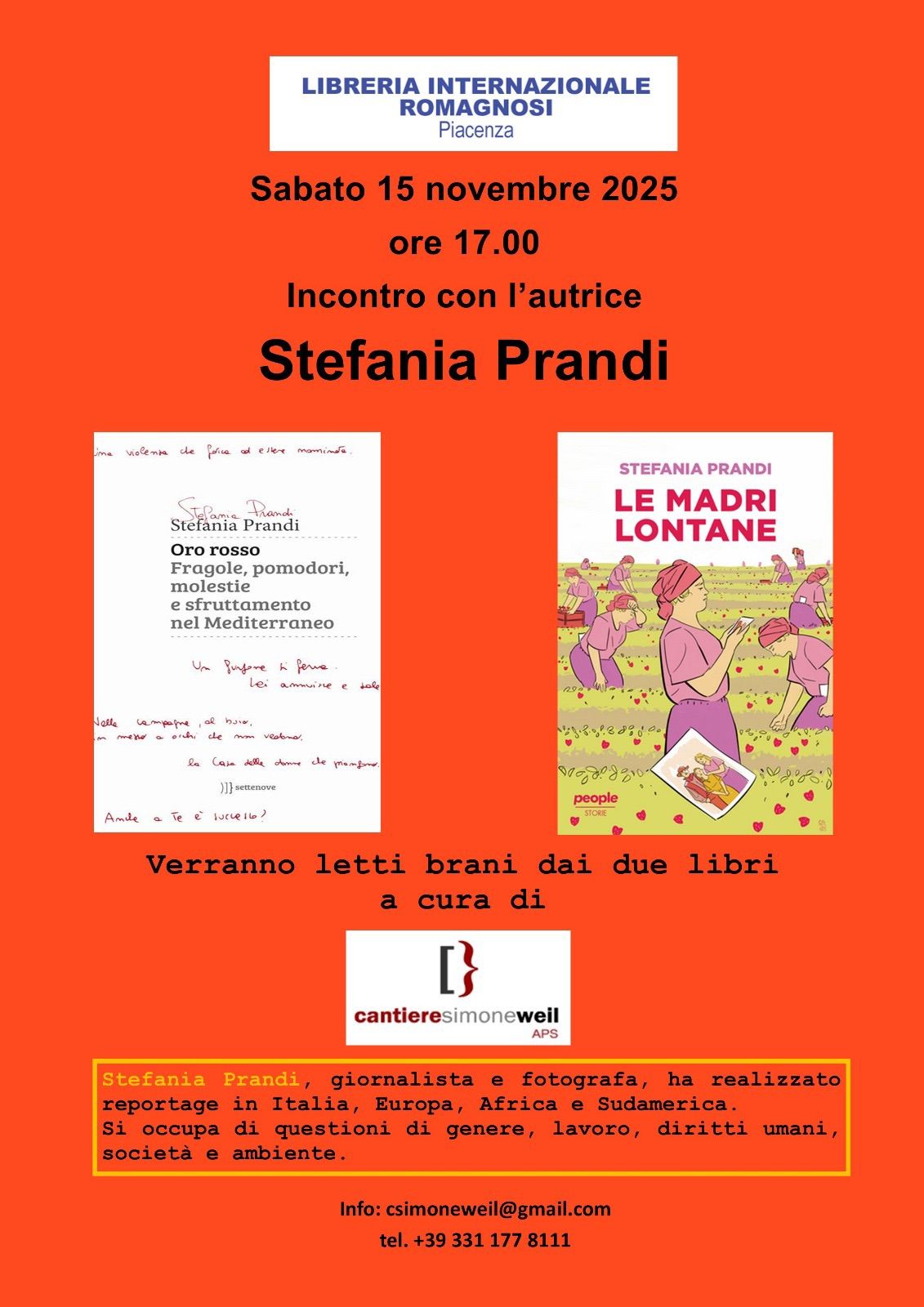Sabato 15 novembre, alle ore 17.00, presso la Libreria internazionale Romagnosi – Gobbi, la giornalista, fotografa e scrittrice Stefania Prandi presenterà i suoi libri Oro Rosso e Le madri lontane in dialogo con il Cantiere Simone Weil.