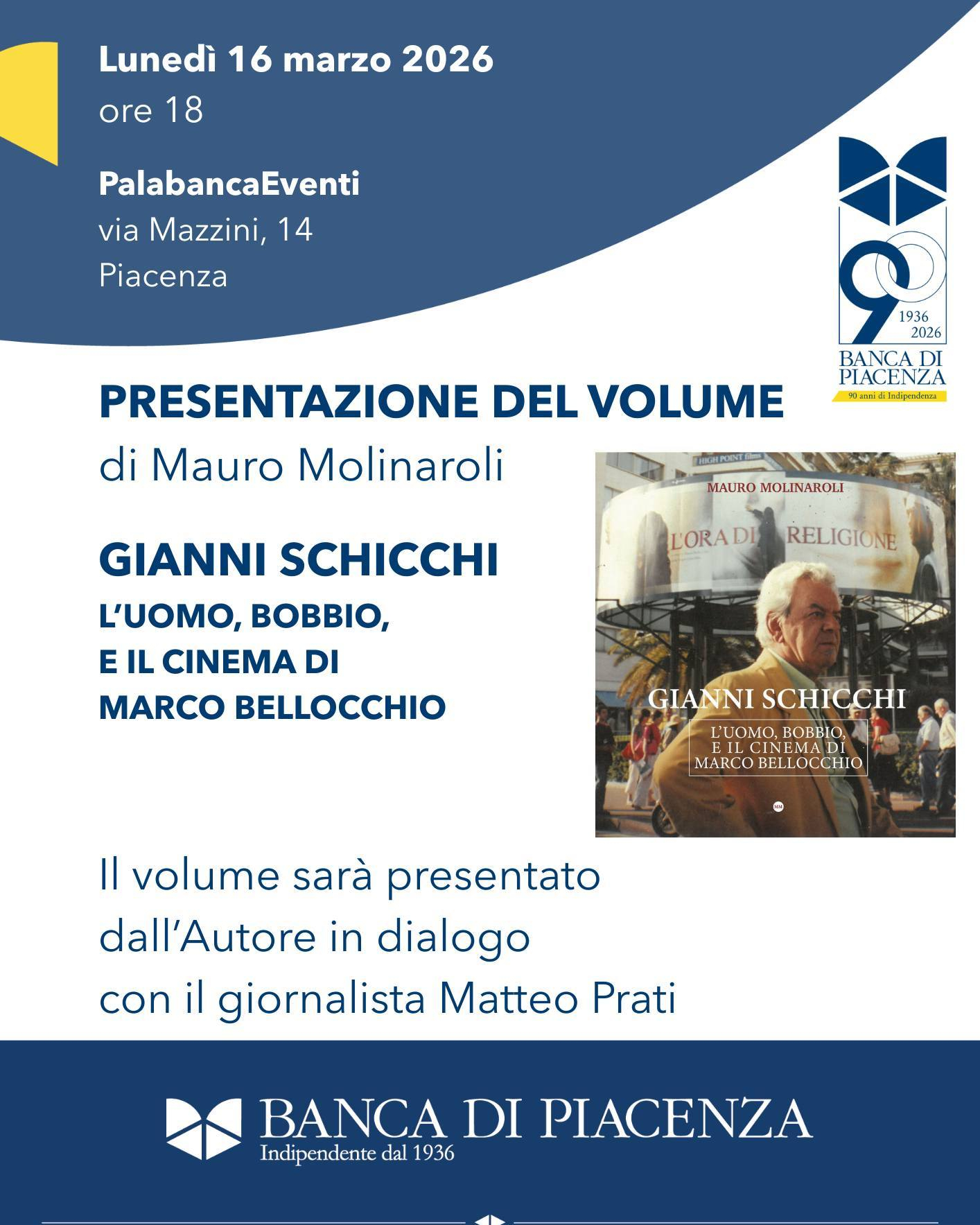 Lunedì 16 marzo alle ore 18.00, al PalabancaEventi, si terrà la presentazione del volume “Gianni Schicchi, l’uomo, Bobbio e il cinema di Marco Bellocchio” di Mauro Molinaroli, iniziativa promossa dalla Banca di Piacenza, che ha sostenuto il progetto editoriale.