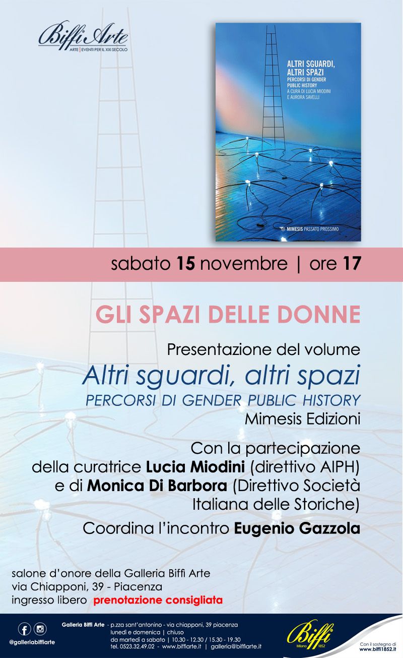 Sabato 15 novembre, alle ore 17.00, nel salone d’onore della Galleria Biffi Arte (via Chiapponi 39), si terrà la presentazione del volume Altri sguardi, altri spazi. Percorsi di gender public history, edito da Mimesis Edizioni.