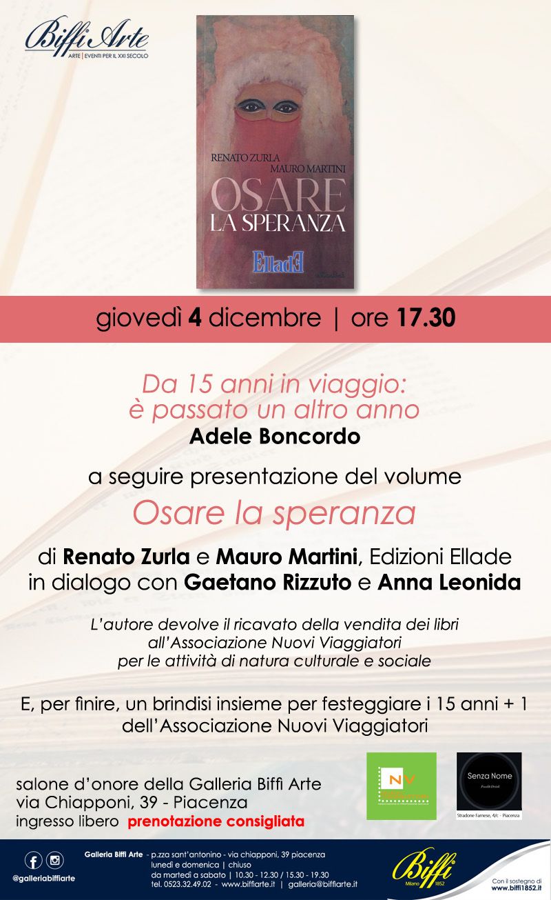 L’incontro si aprirà con Da 15 anni in viaggio: è passato un altro anno, intervento di Adele Boncordo, a cui seguirà la presentazione del volume Osare la speranza di Renato Zurla e Mauro Martini, edito da Ellade.