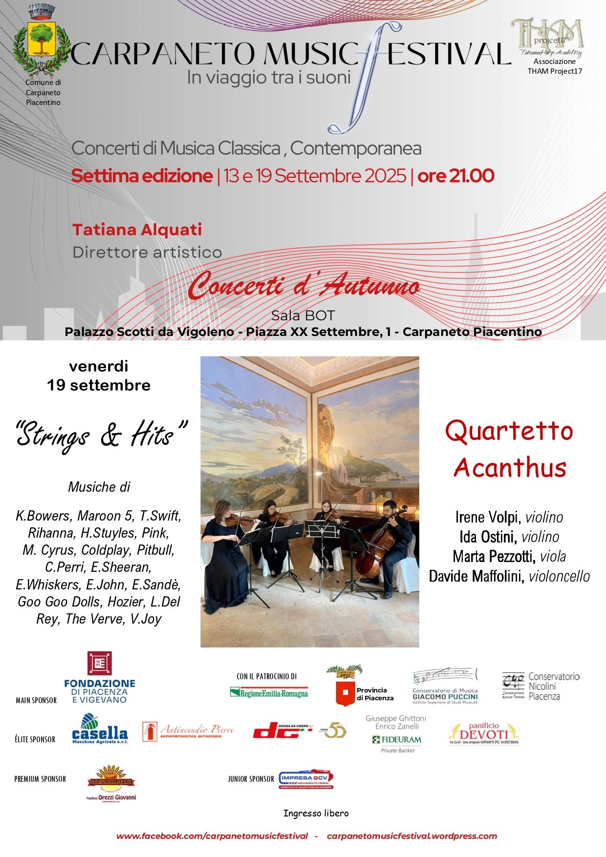 Venerdì 19 settembre alle ore 21.00, presso la Sala BOT del Palazzo Scotti da Vigoleno di Carpaneto Piacentino, si terrà il concerto “Strings & Hits”, appuntamento del Carpaneto Music Festival – Concerti d’Autunno.