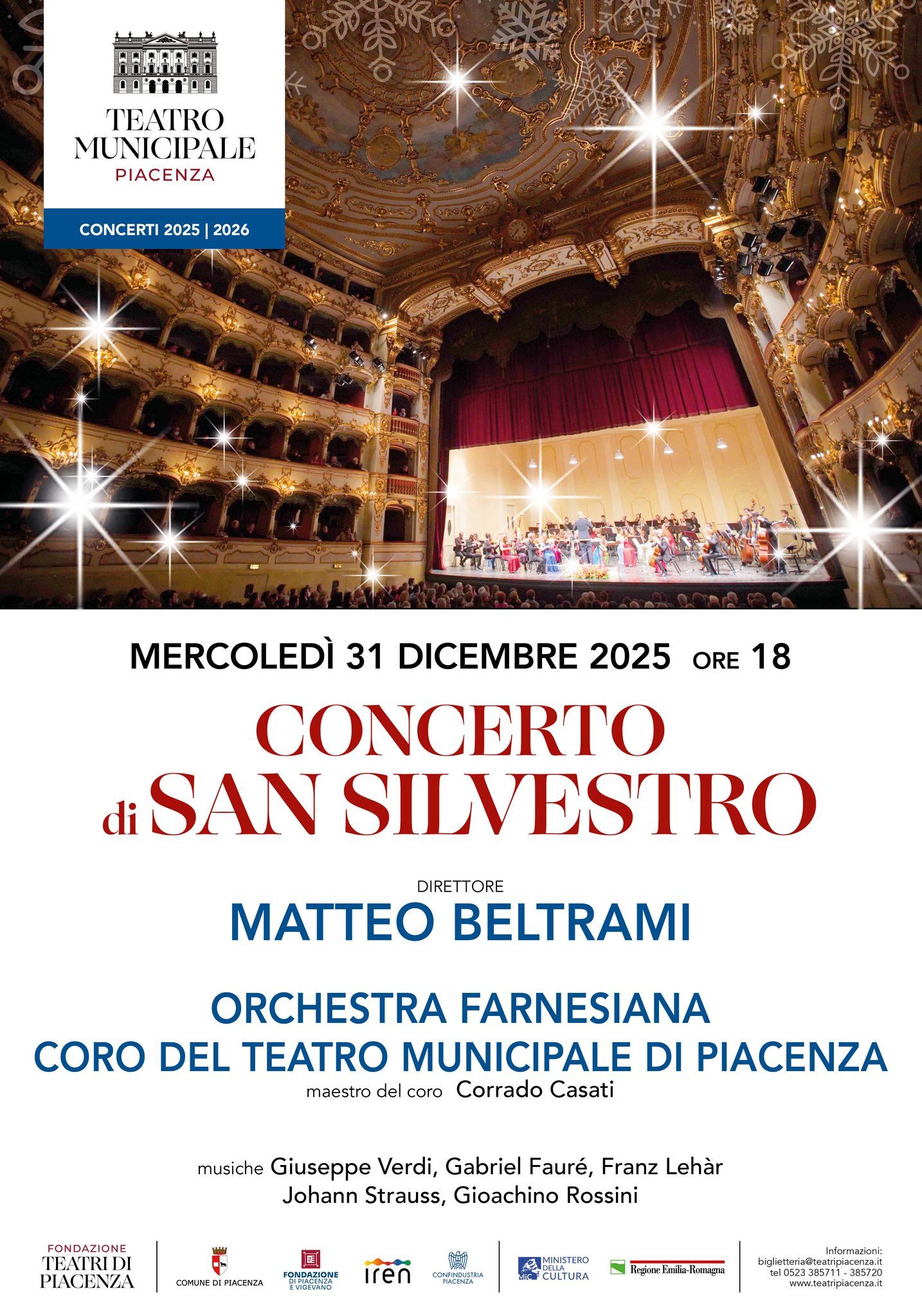 Mercoledì 31 dicembre, alle ore 18.00, il Teatro Municipale di Piacenza ospita il tradizionale Concerto di San Silvestro, appuntamento musicale che accompagna il pubblico verso la fine dell’anno.