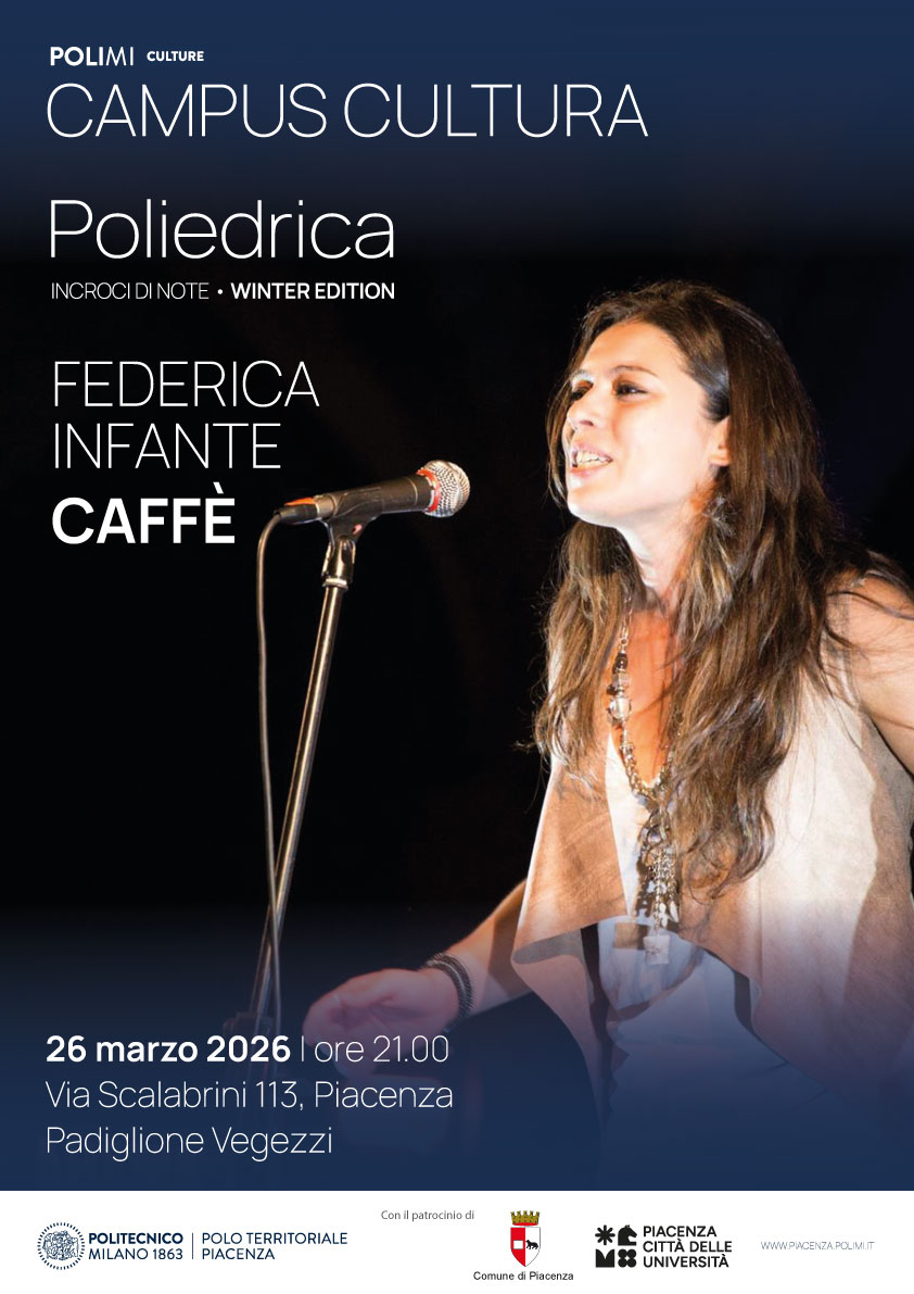 Giovedì 26 marzo alle ore 21.00, al Padiglione Vegezzi, la cantautrice piacentina Federica Infante porta in scena "Caffè", nell’ambito della Winter Edition di Poliedrica, la rassegna culturale del Politecnico di Milano – Polo territoriale di Piacenza.