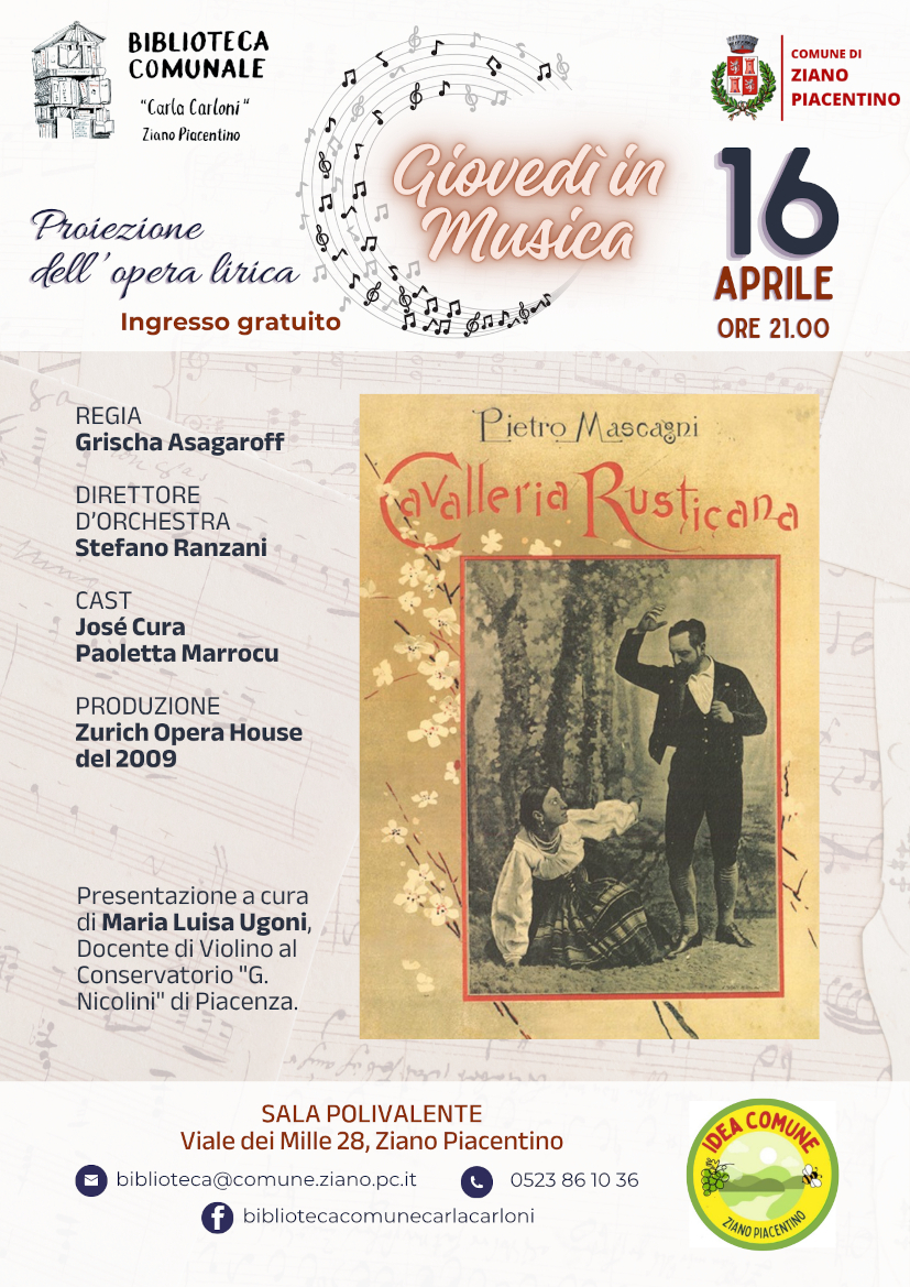 Giovedì 16 aprile alle ore 21.00, alla Sala Polivalente della Biblioteca Comunale di Ziano Piacentino, appuntamento con "Giovedì in Musica", rassegna che propone la proiezione dell’opera lirica Cavalleria Rusticana di Pietro Mascagni.