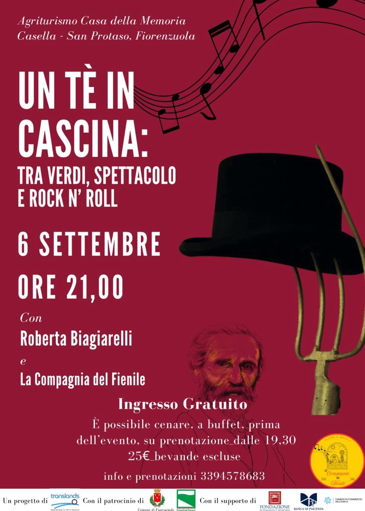 Sabato 6 settembre, alle ore 21.00, presso l’Agriturismo Casa della Memoria Casella – San Protaso, Fiorenzuola, va in scena “Un tè in cascina: tra Verdi, spettacolo e rock’n’roll”.