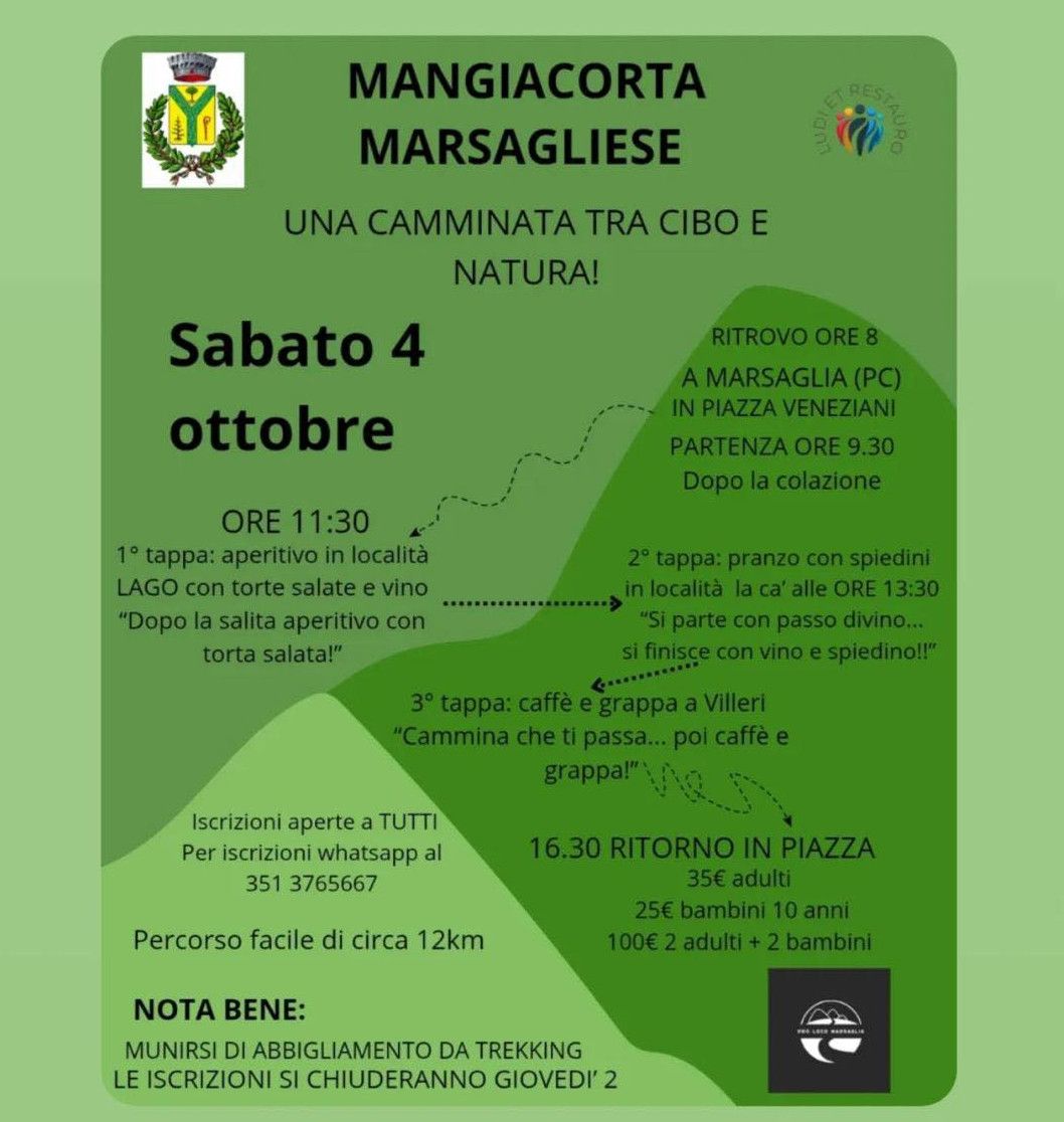 Sabato 4 ottobre, a Marsaglia, si svolgerà la Mangiacorta Marsagliese, una camminata che unisce il piacere del trekking ai sapori della tradizione locale.
