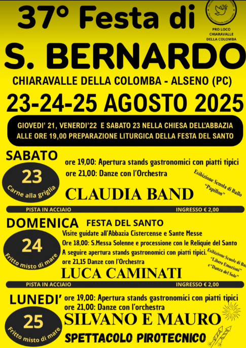 Da sabato 23 a lunedì 25 agosto Chiaravalle della Colomba, frazione di Alseno, ospiterà la 37ª Festa di San Bernardo, tre giorni dedicati a tradizione, gastronomia e divertimento.