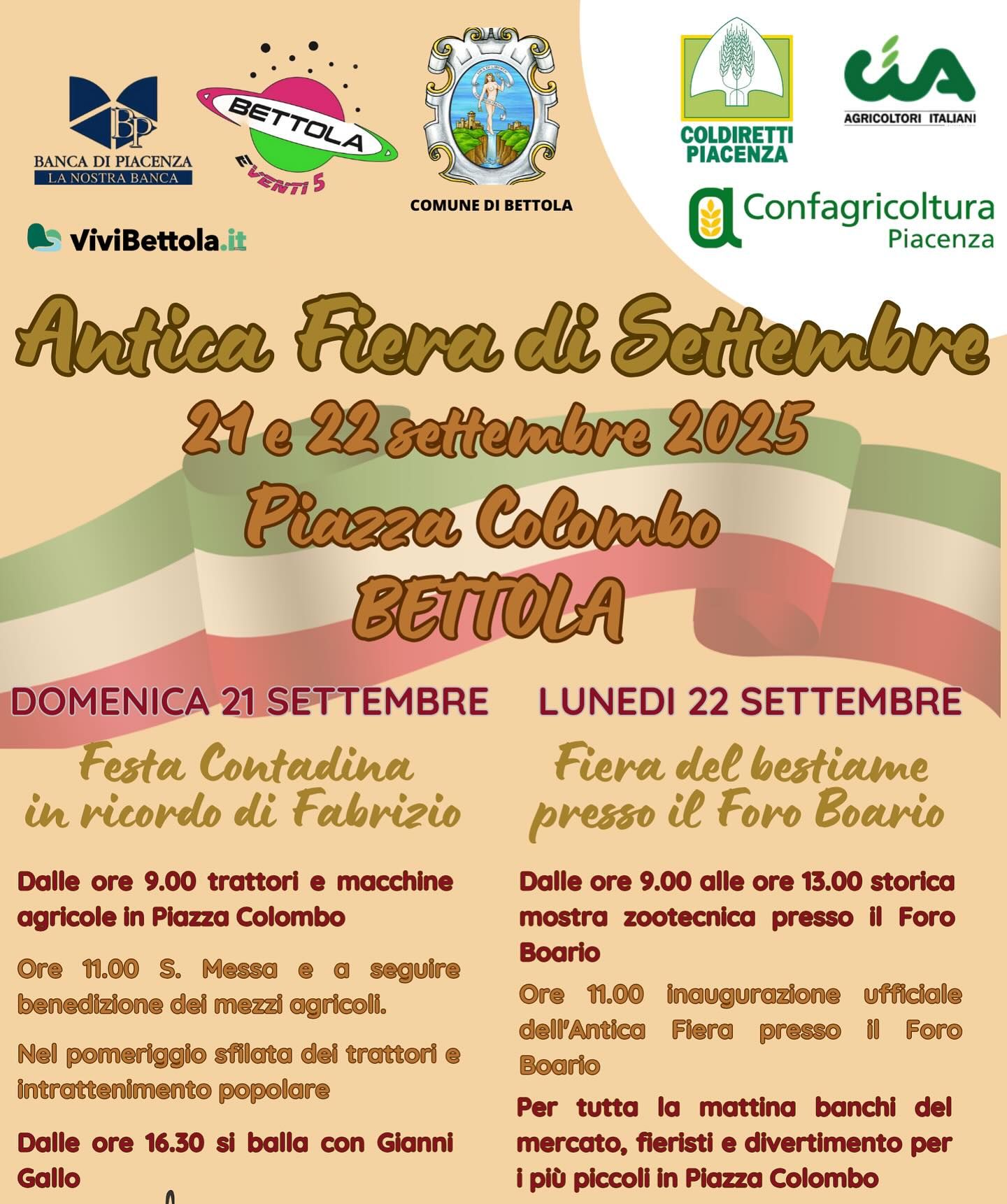 Torna con un doppio appuntamento, domenica 21 e lunedì 22 settembre, la tradizionale Antica Fiera di Settembre di Bettola, due giornate che celebrano la storia, le tradizioni contadine e il mondo agricolo.