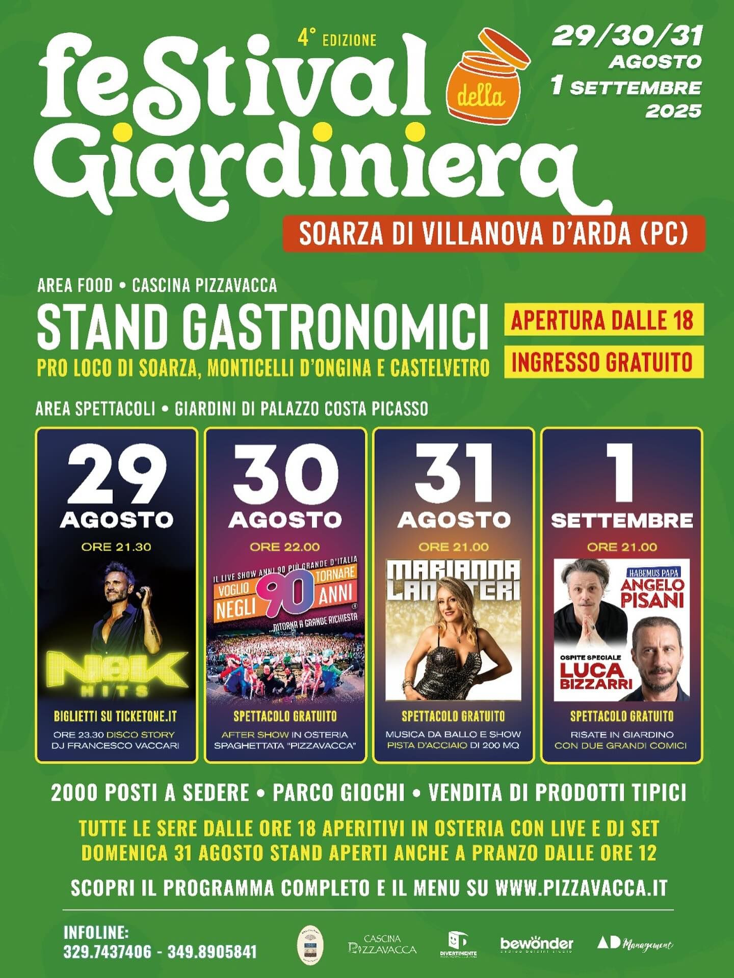 Da venerdì 29 agosto a lunedì 1° settembre torna uno degli appuntamenti più attesi dell’estate piacentina: la quarta edizione del Festival della Giardiniera, ospitato nella suggestiva Cascina Pizzavacca e nei giardini di Palazzo Costa Picasso a Soarza di Villanova d’Arda.
