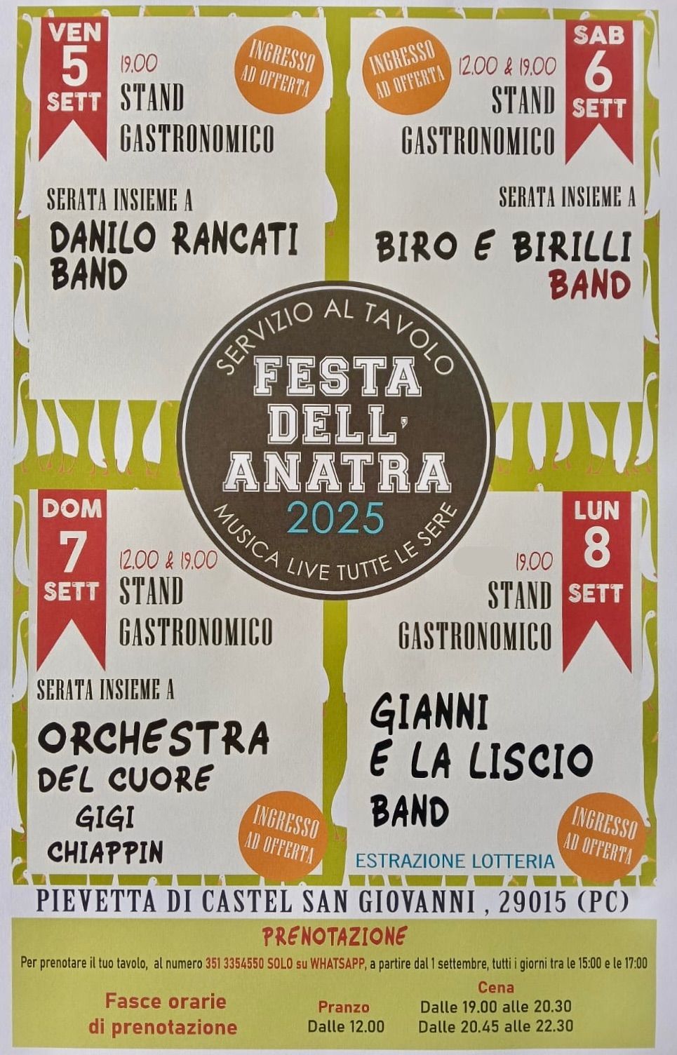 Da venerdì 5 a lunedì 8 settembre torna a Pievetta di Castel San Giovanni, suggestiva frazione lungo il Po, la tradizionale Festa dell’Anatra, quattro giornate dedicate a tradizione, gastronomia e musica dal vivo.