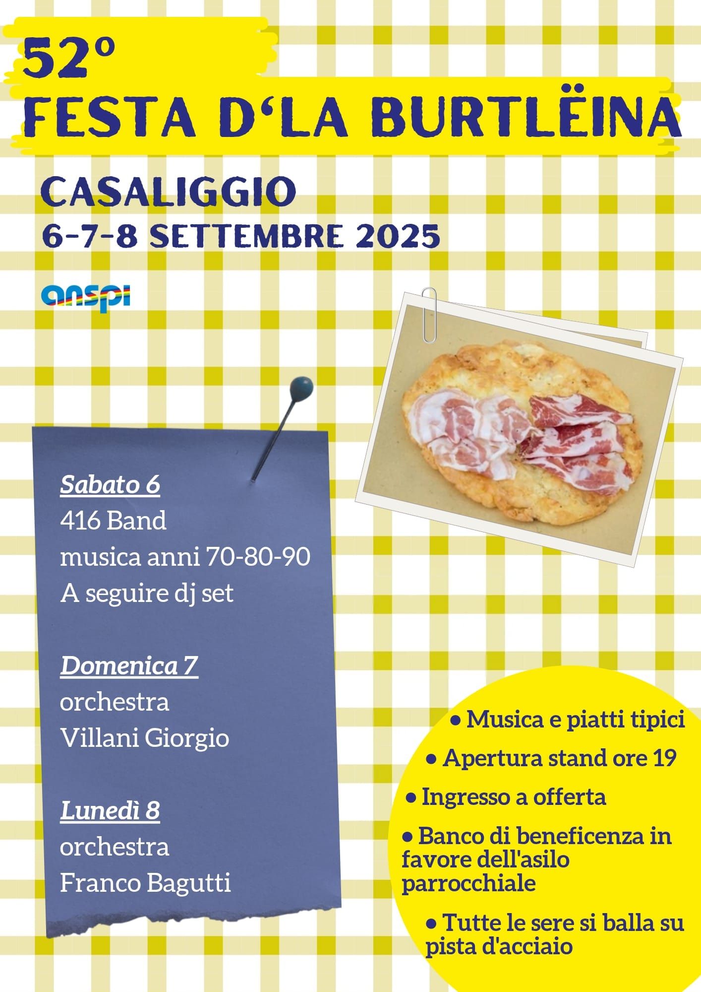 Da sabato 6 a lunedì 8 settembre, Casaliggio di Gragnano si anima con la 52ª edizione della Festa d’la Burtleina: tre giorni all’insegna di gusto, musica e divertimento.