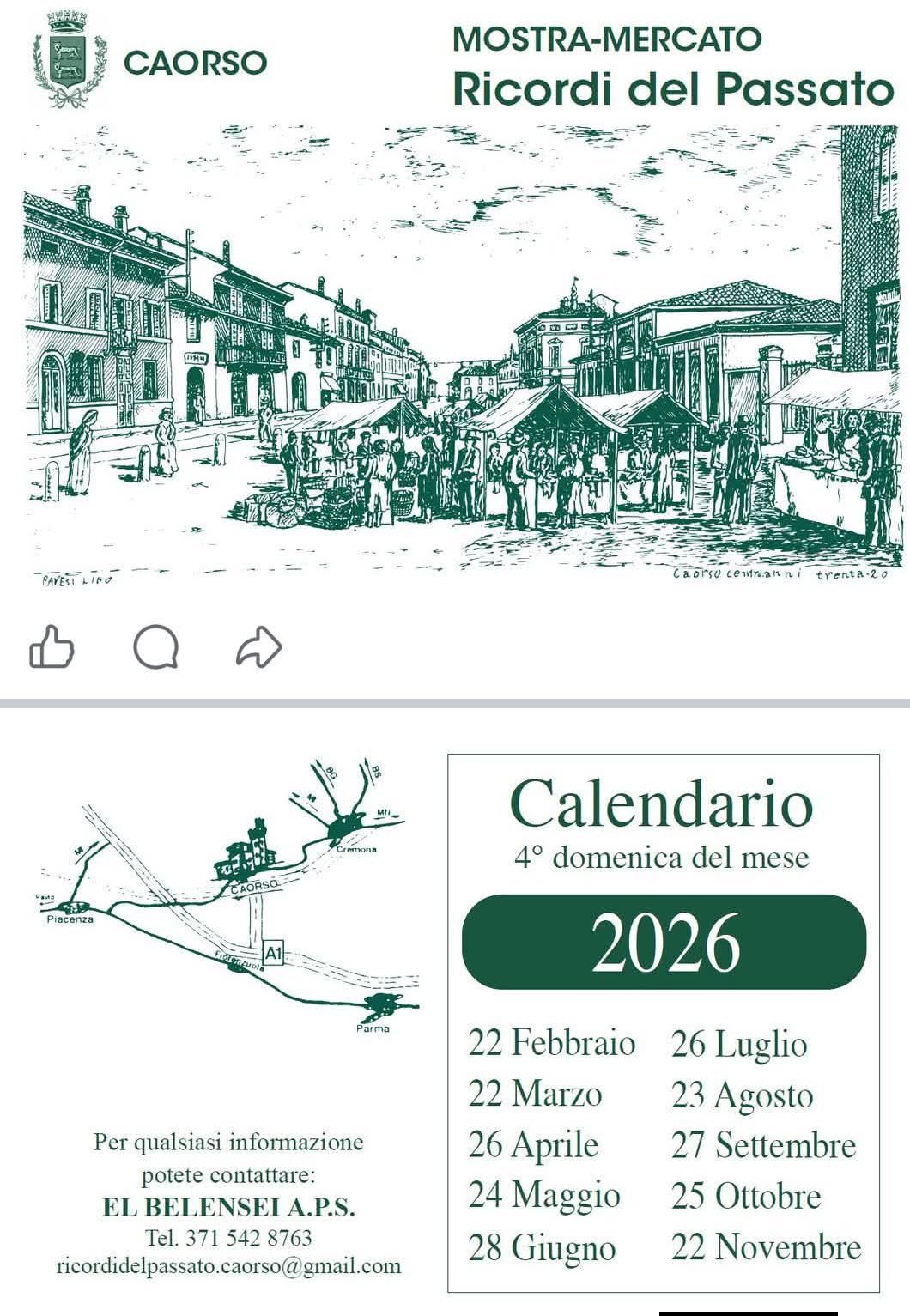 Da febbraio a novembre, ogni quarta domenica del mese torna a Caorso il mercatino storico dell’antiquariato “Ricordi del Passato”, appuntamento dedicato agli amanti del collezionismo, del modernariato e degli oggetti d’altri tempi.