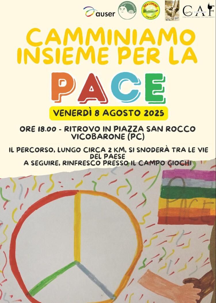 Venerdì 8 agosto a Vicobarone si terrà “Camminiamo insieme per la pace”, una camminata simbolica di circa 2 km per le vie del paese, organizzata dal Circolo Auser di Ziano Piacentino insieme a CAF Vicobarone, Pe d’Fer, Auser e Idea Comune.